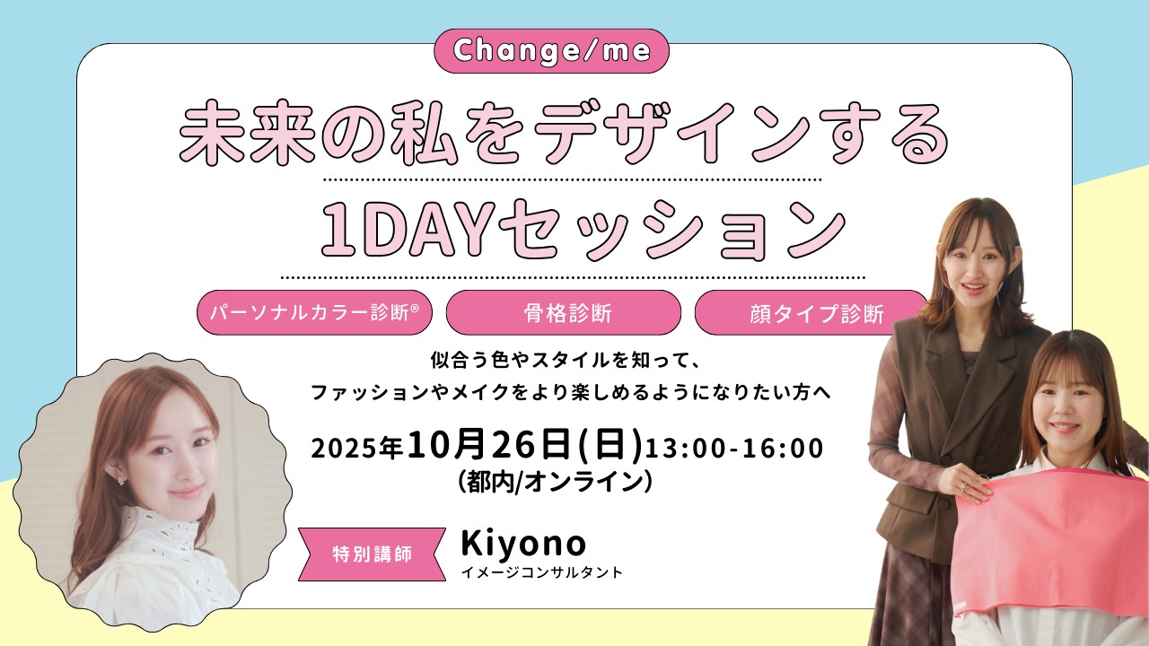 1:00 PM - 4:00 PM 【10/26開催】【会員/一般】未来の私をデザインする 1DAYセッション 10月 26 @ 1:00 PM - 4:00 PM 【10/26開催】【会員/一般】未来の私をデザインする 1DAYセッション Change/me × イメージコンサルタント kiyono Special Program 「似合うだけじゃ […]